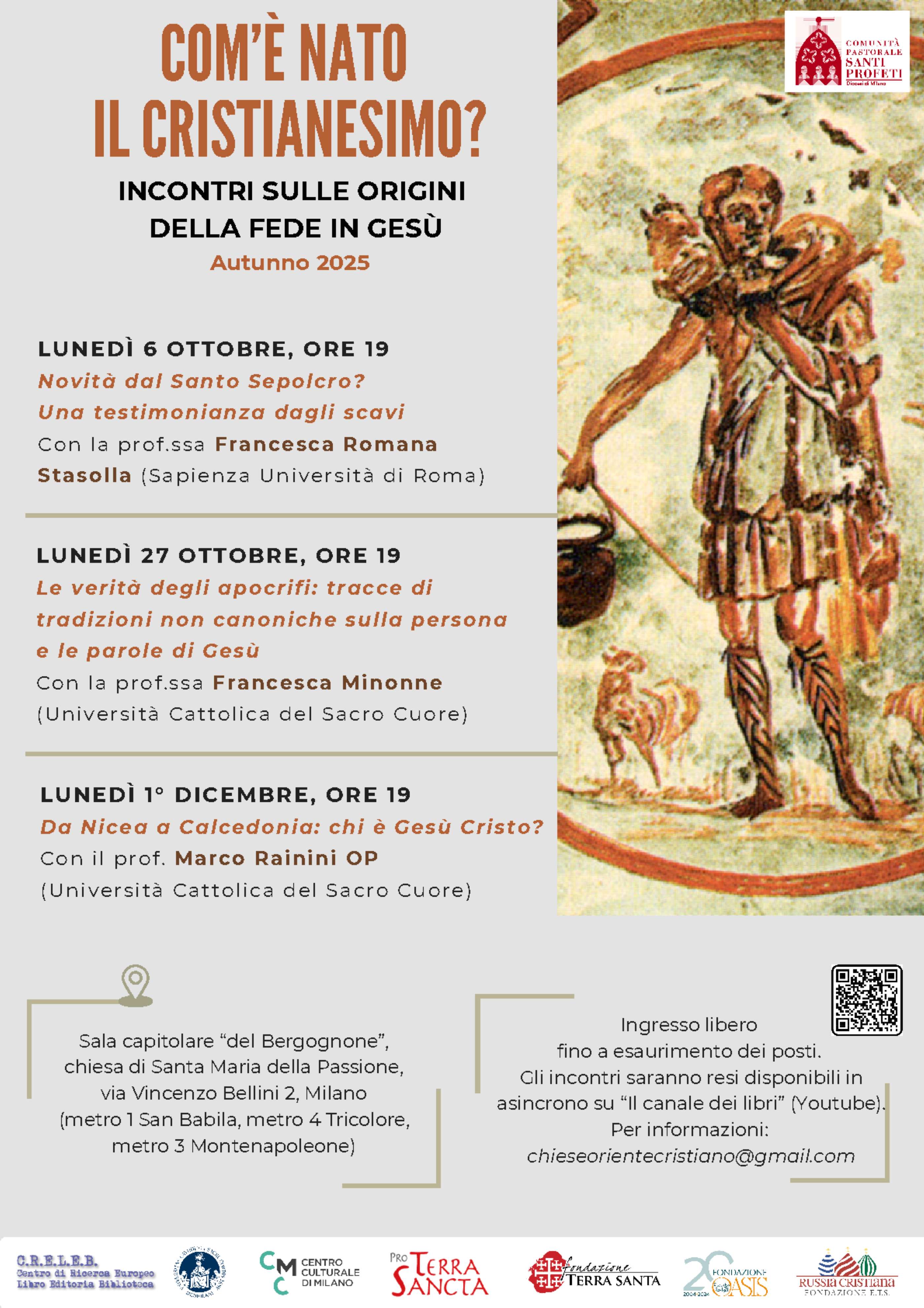 Dopo le esperienze positive degli anni passati, la Comunità Pastorale “Santi Profeti” di Milano torna a promuovere un nuovo ciclo di incontri, questa volta intitolato “Com’è nato il cristianesimo?”. L’organizzazione è lieta di annunciare un programma di appuntamenti dedicati allo studio delle origini e dei primi sviluppi della fede in Gesù. Ripercorrendo le tracce tangibili del Suo passaggio attraverso luoghi, reperti archeologici e fonti scritte, l’iniziativa intende mettere in luce le modalità con cui le prime comunità cristiane hanno trasmesso alla storia l’esperienza della fede.