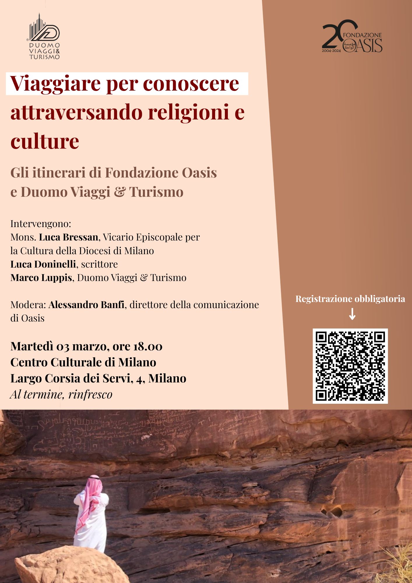 Martedì 3 marzo alle ore 18.00, presso il Centro Culturale di Milano (Largo Corsia dei Servi, 4), Fondazione Oasis e Duomo Viaggi & Turismo terranno l’evento Viaggiare per conoscere attraversando religioni e culture.