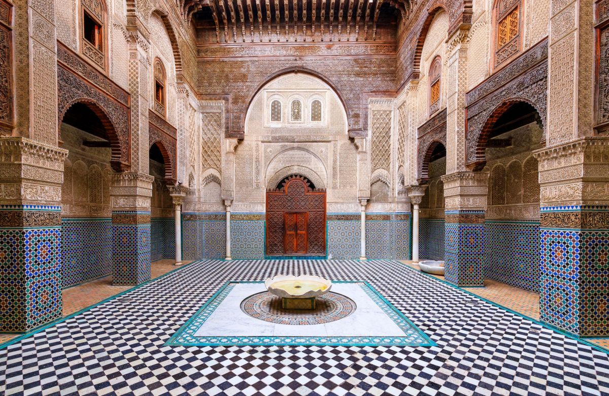 Al mattino visita del Mausoleo di Mohammed V, padre fondatore del Marocco moderno, e del figlio Hassan II, rispettivamente nonno e padre dell’attuale re Mohammed VI. Il mausoleo, riccamente decorato con mosaici e zellij, è un’altra eloquente testimonianza della tradizione architettonica marocchina. In seguito visita della torre di Hassan II, minareto incompiuto voluto nel 1195 dal sultano almohade Yacoub al-Mansour, e poi trasferimento a Salé, città antagonista di Rabat, e in particolare visita alla Madrasa Abu al-Hasan. Pranzo al ristorante. Nel pomeriggio incontro con l’arcivescovo di Rabat, il Cardinale Cristobal López Romero, o con un suo rappresentante, e poi partenza per Fes, cuore religioso del Marocco e una delle città più affascinanti del mondo arabo, con le sue mura e la sua medina ricca di moschee, scuole coraniche e botteghe. Lungo la strada sosta a Meknes, che fu capitale del Marocco dal 1672 al 1727, e visita della porta di Bab Mansour, una delle più belle del Marocco, e del Mausoleo di Moulay Ismail. Sistemazione in albergo Les Merinides (o similare), cena e pernottamento.
